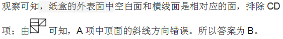 参考答案: A 本题解释:【答案】A。解析:根据“立体图形中两个阴影三角形的相对位置”做题,BCD图形中形成的立体图形,上下面的阴影三角形应该是处于相同位置,即位于同一侧,均不符合题干,故正确答案为A。