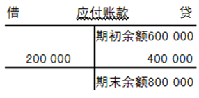 【例题】某企业应付账款的期初余额为600 000元,本期应付账款贷方发生额合计为400 000元,本期应付账款借方发生额合计为200 000元。则应付账款账户的期末余额( )。