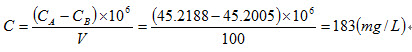 用重量法测定水中悬浮物时,首先将空白滤膜和称量瓶烘干、冷却至室温,称量至恒重,称得重量为45.2005g:取水样100ml抽滤后,将悬浮物、过滤膜和称量瓶经烘干、冷却至室温,称量至恒重,称得重量为45.2188g;试计算水样中悬浮物的浓度。