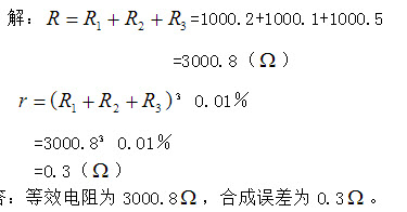 44、问答题 计算题:绝对误差为0.2;相对误差为0.2%;修正值为-0.2%。6.有3只标称值均为1k的电阻,用0.01级的电桥测量,其阻值依次为1000.2、1000.1和1000.5,求三只电阻串联后的等效电阻及其合成误差。