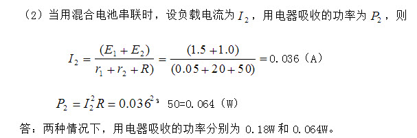 6、问答题 计算题:有两只电动势为1.5V,内阻1r为0.05的干电池,串联后向电阻R为50的用电器供电。问用电器吸收的功率为多少?若将其中一个电池用电动势为1.0V,内阻2r为20的废旧电池替换时,用电器吸收的功率是多少?