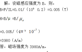 计算题:在匀强磁场中,把长为20cm的导线和磁场成垂直放置,在导线中通10A电流时,受到的作用力为0.01N,求磁场强度多大?(设空气中的磁导率