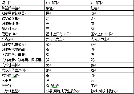 3、问答题 试列表比较G+与G-细菌间的10种主要差别。