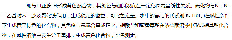 本题解析:水中甲醛与4-氨基-3-联氨-5-巯基-1,2,4-三氮杂茂(AHMT)在碱性条件下缩合后,经高碘酸钾氧化成6-巯基-S-三氮杂茂[4,3-b]-S-四氮杂苯红色化合物,其颜色深浅与甲醛含量成正比。2,3-二氨基萘在pH1.5~2.0溶液中,选择性地与四价硒离子反应生成苯并(c)硒二唑化合物绿色荧光物质,用环己烷萃取,产生的荧光强度与四价硒含量成正比。在酸性溶液中,六价铬可与二苯碳酰二肼作用,生成紫红色络合物,比色定量。N,N-二乙基对苯二胺(DPD)与水中游离余氯迅速反应而产生红色。在碘化物催化下,一氯胺也能与DPD反应显色。