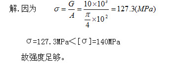 195、问答题 计算题:当使用一根φ10mm的圆钢吊一重量G为10KN的重物时,若圆钢材料的许用拉应力[σ]=140MPa,验算该圆钢的强度是否足够?
