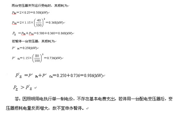 193、问答题 计算题:某客户10kV照明用电,受电容量200kV?A,由两台10kV同系列100kV?A节能变压器并列运行,其单台变压器损耗P0=0.25kW,Pk=1.15kW。某月,因负荷变化,两台变压器负荷率都只有40%。问其是否有必要向供电企业申请暂停1台受电变压器?