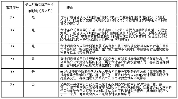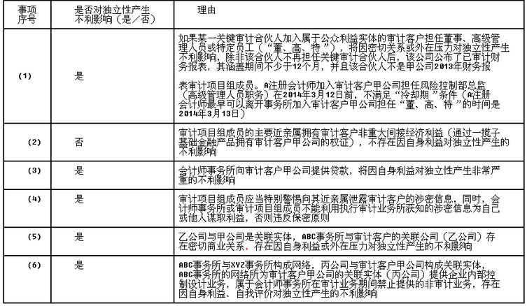 200、问答题 2013年10月1日,ABC会计师事务所拟与上市公司甲公司续签2013年度财务报表的审计业务约定书。XYZ会计师事务所和ABC会计师事务所共享所有权、控制权和重要的专业资源。ABC会计师事务所遇到下列与职业道德有关的事项:(1)ABC会计师事务所委派A注册会计师担任甲公司2013年度财务报表审计项目合伙人,A自2008年起就一直担任甲公司的财务报表审计项目合伙人。(2)ABC会计师事务所员工为甲公司秘书提供投资决策所需要的行业数据资料。(3)ABC会计师事务所员工注册会计师C的父亲是甲公司独立董事,ABC会计师事务所未委派注册会计师C参与甲公司2013年度财务报表审计。(4)甲公司是D集团的全资子公司,XYZ会计师事务所首次承接D集团财务报表审计业务,ABC会计师事务所向XYZ事务所提供了甲公司2010年至2012年财务报表审计工作底稿的电子版。(5)XYZ会计师事务所的注册会计师E于2013年开始基于编制会计分录的目的为甲公司计算递延所得税资产和递延所得税负债。(6)ABC会计师事务所的分所注册会计师F自2012年2月1日起担任甲公司全资子公司P公司的首席法律顾问。要求:针对上述第(1)至(6)项,逐项指出是否会对ABC会计师事务所或审计项目组成员的独立性产生不利影响,并简要说明理由。