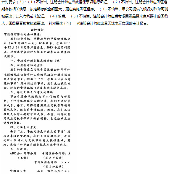 本题解析:试题答案(1)针对资料二的审计处理如下:①注册会计师应建议甲公司调整,审计调整分录为:借:应收账款1000贷:预收款项1000借:资产减值损失250贷:应收账款-坏账准备200[1000×5%+(5000×5%-100)]其他应收款一坏账准备(1000×5%)50②甲公司会计处理正确,无须建议调整;③注册会计师应建议调整,审计调整分录为:借:营业收入120贷:预收款项20应收账款100④注册会计师应建议披露,并同时调整,审计调整分录为:至2013年6月30日,甲公司已计提折旧金额=(1050-50)÷10×1.5=150(万元),2013年应计提的折旧金额=[(1050-50)÷10÷2]+[(1050-150)÷(6-1.5)÷2]=150(万元)借:管理费用150贷:固定资产-累计折旧150⑤注册会计师应建议调整,审计调整分录为:借:营业外支出100贷:预计负债100⑥注册会计师应建议调整,审计调整分录为:该配件所生产的A产品成本=100×(15+15)=3000(万元)。其可变现净值=100×(25.5-1.5)=2400(万元),A产品发生减值。该配件的可变现净值=100×(25.5-15-1.5)=900(万元)。应计提的存货跌价准备=100×15-900=600(万元)。借:资产减值损失50贷:存货-存货跌价准备50⑦甲公司的处理正确,无须建议调整。⑧注册会计师应建议调整,审计调整分录为:借:营业外收入300贷:投资性房地产-成本300借:投资性房地产-投资性房地产累计折旧(摊销)1.5(300÷50÷12×3)贷:管理费用1.5借:营业成本30贷:管理费用30⑨注册会计师应建议调整,审计调整分录为:借:应付股利80贷:未分配利润80此事项为资产负债表日后企业利润分配方案中拟分配的以及经审议批准宣告发放股利的事项,应在财务报表附注中作为资产负债表日后非调整事项披露。⑩注册会计师应建议调整,审计调整分录为:借:固定资产-固定资产减值准备120贷:资产减值损失120此事项为资产负债表日后因自然灾害导致资产发生的重大损失事项,应在财务报表附注中作为财务报表日后非调整事项披露。(2)针对事项(1),注册会计师应当出具否定意见的审计报告;针对事项(2),注册会计师应当出具标准无保留意见的审计报告;针对事项(3),注册会计师应当出具保留意见的审计报告;针对事项(4),注册会计师应当出具否定意见的审计报告;针对事项(5),注册会计师应当出具保留意见的审计报告;针对事项(6),注册会计师应当出具标准无保留意见的审计报告;针对事项(7),注册会计师应当出具带强调事项段的无保留意见的审计报告;针对事项(8),注册会计师应当出具否定意见的审计报告;针对事项(9),注册会计师应当出具标准无保留意见的审计报告;针对事项(10),注册会计师应当出具保留意见的审计报告。(3)