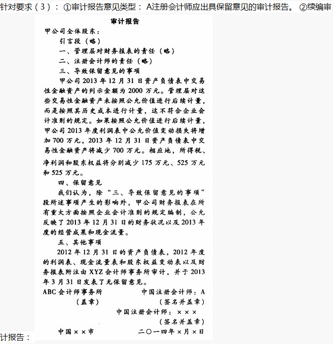 (3)在资料一的基础上,如果考虑重要性,假定甲公司只存在资料二中的事项(4),并且拒绝接受A和B注册会计师提出的审计处理建议(如果有),在不考虑其他条件的前提下,代为续编以下审计报告。