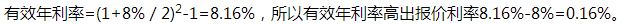 47、单项选择题 一项1000万元的借款,借款期3年,年利率为5%,若每半年复利一次,有效年利率会高出报价利率()。