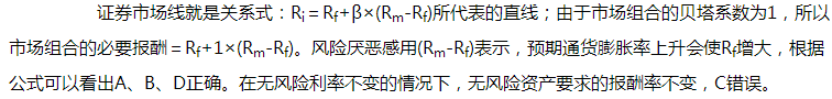本题解析:预计通货膨胀率提高时,无风险利率会随之提高,它所影响的是资本市场线的截距,不影响斜率。资本市场线的斜率代表风险的市场价格,它表示当标准差增长某一幅度时相应必要报酬率的增长幅度。