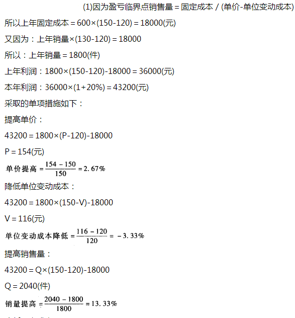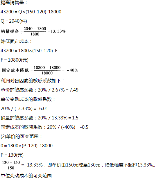 本题解析:试题答案(1)本月的利润=1500×(120-80)-24000=36000(元)(2)提高后的利润为36000×(1+25%)=45000(元),可以从四个方面采取措施:①降低固定成本:降低后的固定成本=1500×(120-80)-45000=15000(元),即固定成本降低(24000-15000)/24000×100%=37.5%。②提高单价:提高后的单价=80+(24000+45000)/1500=126(元),即单价提高(126-120)/120×100%=5%。③降低单位变动成本:降低后的单位变动成本=120-(24000+45000)/1500=74(元),即单位变动成本降低(80-74)/80×100%=7.5%。④提高销售量:提高后的销售量=(24000+45000)/(120-80)=1725(件),即销售量提高(1725-1500)/1500×100%=15%。(3)固定成本对利润的敏感系数=25%/(-37.5%)=-0.67,或者=-24000/36000=-0.67单价对利润的敏感系数=25%/5%=5,或者=120×1500/36000=5单位变动成本对利润的敏感系数=25%1(-7.5%)=-3.33,或者=-80×1500/36000=-3.33销量对利润的敏感系数=25%/15%=1.67,或者=(120-80)×1500/36000=1.67根据计算结果可知,单价是最敏感的因素。