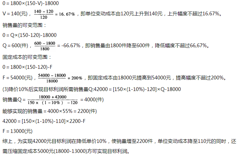 7、问答题 计算分析题:某企业只产销一种产品,盈亏临界点销售量为600件,单价为150元,单位成本为130元,其中单位变动成本为120元。要求通过计算回答下列互不相关问题:(1)若使本年利润比上年增长20%,应采取哪些单项措施才能实现目标利润。并对你提出的各项措施测算利润对其的敏感系数。(2)如果计划年度保证经营该产品不亏损,应把有关因素的变动控制在什么范围?(3)假设该企业拟实现42000元的目标利润,可通过降价10%来扩大销量实现目标利润,但由于受生产能力的限制,销售量只能达到所需销售量的55%,为此,还需在降低单位变动成本上下功夫,但分析人员认为经过努力单位变动成本只能降至110元,因此,还要进一步压缩固定成本支出。针对上述现状,会计师应如何去落实目标利润?