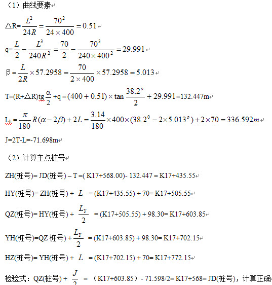 计算题:某平原区二级公路有一弯道,转角点桩号为JDK17+568.00,转角α=38°30′,试计算该曲线设置缓和曲线后的五个基本桩号(ZH,HY,YH,HZ,QZ),二级公路设计车速为80km/h,缓和曲线计算公式: