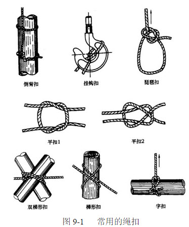 本题解析:试题答案常用的绳扣有平扣、三角扣、琵琶扣、挂钩扣、环扣、倒背扣、梯形扣和双梯形扣等,如图9-1所示。