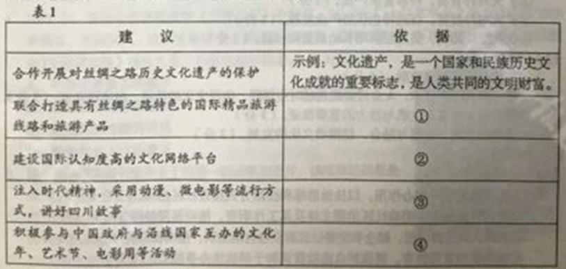 材料三 “一带一路”既是经贸之路,也是文化之路。某校高二(1)班同学围绕“四川省如何增进与‘一带一路’沿线国家的文化交流”展开讨论,提出了建议(见表1)。
