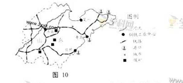 (3)图10中反映了哪些有利于山东省发展钢铁工业的区位条件?请列举两条。(6分)