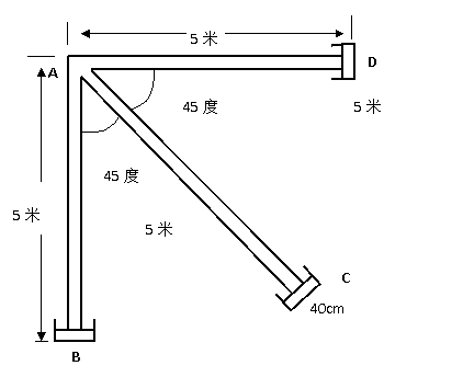 ①场地为一直角的两边和中间平分角线各长5米,宽5厘米的三向跑道线(地板为水泥地);起终点均设在直角顶点处(起、终点线均经过A点,其中起点线垂直于AB,终点线垂直于AD),在起、终点三向跑道的顶端各画一条长40厘米,宽5厘米的标志线。