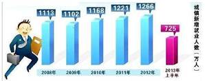 2008年至2013年上半年我国城镇新增就业人数统计图?