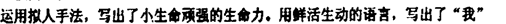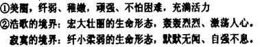 本题解析: 小题1:本题重点考查考生归纳内容要点,概括中心意思的能力。能力层级C级。 A项,以偏概全。“一直感到自己的渺小与卑微”错,后来作者见到小花小草后,“领略了弱小生命吟出的生的礼赞”后,就不再感到自己的渺小与卑微了。 B项,曲解文意。作者引用“朝菌”、“蟪蛄”,目的是抒写人生的渺小与短暂。 D项,分析行文思路错误。选取了三个场景,分别是巨大的银杏树、崂山顶的小花和长白山林场的白头翁;但只有两个角度,即浩歌的境界与寂寞的境界。 小题1:①美丽;②纤弱,稚嫩;③顽强,不怕困难;④充满活力 解析本题重点考查考生筛选并整理信息的能力。能力层级C级。 本题的答案区间在第8、9自然段,可以找到对应的信息。 小题1:①浩歌的境界:宏大壮丽的生命形态,轰轰烈烈、激荡人心。 ②寂寞的境界:纤小柔弱的生命形态,默默无闻、自强不息。 ③相同点:二者都是生命的奇观,都是生命力量的展示。 本题重点考查考生理解文中重要词语的能力。能力层级B级。 本题的答案区间是第2、9、10自然段。浩歌的境界指像银杏树一样的那种气魄、恢宏、博大、顽强的生命形态,寂寞的境界指像小花小草一样的那种纤细、孱弱、微小的生命形态。二者的相同点是“都是造物主无与伦比的杰作,都是生命的奇观”。 小题1:运用拟人手法,写出了小生命顽强的生命力,用一个“染”字,鲜活生动的写出了见到这些小生命的惊喜与感动之情。 本题考查学生辨析常见修辞手法的能力,对修辞手法的分析格式为:句子的意思是什么+写出了什么状态、景象(特征)+表达了什么感情。 小题1:本题是一道开放题,要求学生根据自己对所描写景物(景色)的理解,谈人生的启示。其实,这类景色(景物)很多,论语中有“岁寒,然后知松柏之后凋也”的句子。学生可以根据自己的生活感受写。注意两个要点:一、景色(景物),二、(启示)