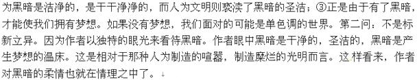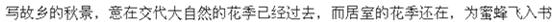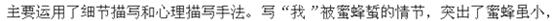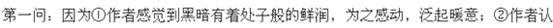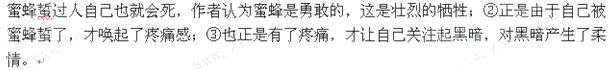 3、阅读题 阅读下面文章,回答下列小题。 我对黑暗的柔情 迟子建 ①我回到故乡时,已是晚秋的时令了。农人们在田地里起着土豆和白菜,采山的人还想在山林中做最后的淘金,他们身披落叶,寻觅着毛茸茸的蘑菇。小城的集市上,卖棉鞋棉帽的人多了起来,大兴安岭的冬天就要来了。 ②窗外的河坝下,草已枯了。夏季时繁星一般闪烁在河畔草滩上的野花,一朵都寻不见了。母亲侍弄的花圃,昨天还花团锦簇的,一夜的霜冻,就让它们腰肢摧折,花容失色。 ③大 自然的花 季过去了,而居室的花季还在。母亲摆在我书房南窗前的几盆花,有模有样地开着。蜜蜂在户外没有可采的花蜜了,当我开窗通风的时候,它们就飞进屋子,寻寻觅觅的。不知它们 青睐的是金黄的秋菊,还是水红的灯笼花? ④那天下午,我关窗的时候,忽然发现一只金色的蜜蜂,它蜷缩在窗棂下,好像采蜜采累了,正在甜睡。我想都没想,捉起它,欲把它放生。然而就在我扬起胳膊的那个瞬间,我左手的拇指忽然针刺般地剧痛,我意识到蜜蜂蜇了我了。 ⑤蜜蜂走了,它留在我拇指上的,是一根蜂针。蜂针很细,附着白色的絮状物,我把它拔了出来。我小的时候,不止一次被蜜蜂蜇过,记得有一次在北极村,我撞上马蜂窝,倾巢而出的马蜂蜇得我面部红肿,疼得我在炕上直打滚。 ⑥别看这只蜜蜂了无生气的样子,它的能量实在是大。我的拇指顷刻间肿胀起来,而且疼痛难忍。我懊恼极了,蜜蜂一定以为我要置它于死地,才使出它的撒手锏。而蜇过了人的蜜蜂,会气绝身亡,即使我把它放到窗外,它也不会再飞翔。我和它,两败俱伤。 ⑦我以为疼痛会像闪电一样消逝的,然而一个小时过去了,两个小时过去了,到了晚饭的时候,我的拇指仍然锥心刺骨地疼。天刚黑,我便钻进被窝,想着进入梦乡了,就会忘记疼痛。然而辗转着熬到深夜,疼痛非但没有减弱,反而像涨潮的海水一样 ,一浪高过一浪。我不得不从床上爬起,打开灯,察看伤处。我想蜜蜂留在我手指上的蜂针,一定毒素甚剧,而我拔蜂针时,大约拔得不彻底,于是拿出一根缝衣服的针,划了根火柴,简单地给它消了消毒,将针刺向痛处,企图挑出可能残存着的蜂针。针进到肉里去了,可是血却出不来,好像那块肉成了死肉,让我骇然。想到冷水可止痛,我便用冷水冲拇指。这招儿倒是灵验,痛感减轻了不少,十几分钟后,我回到了床上。然而才躺下,刚刚缓解的疼痛又傲慢地抬头了,没办法,我只得起来。病急乱投医,一会儿抹风油精,一会儿抹牙膏,百般折腾,疼痛却仍如高山的雪莲一样,凛冽地开放。我泄气了,关上灯,拉开窗帘,求助于天。 ⑧已经是子夜时分了,如果天气好,我可以望见窗外的月亮,星星,可以看见山的剪影。然而那天阴天,窗外一团漆黑,什么也看不见。人的心真是奇怪,越是看不见什么,却越是想看。我将脸贴在玻璃窗上,瞪大眼睛,然而黑夜就是黑夜,它毫不含糊地将白日我所见的景致都抹杀掉了。我盼望着山下会突然闪现出打鱼人的渔火,或是堤坝上有汽车驶过,那样,就会有光明划破这黑暗。然而没有,我的眼前仍然是沉沉的无边的暗夜。 ⑨我已经很久没有体味这样的黑暗了。都市的夜晚,由于灯火作祟,已没有黑暗可言了;而在故乡,我能伫立在夜晚的窗前,也完全是因为月色的诱惑。有谁会欣赏黑暗呢?然而这个伤痛的夜晚,面对着这处子般鲜润的黑暗,我竟有了一种特别的感动,身上渐渐泛起暖意,有如在冰天雪地中看到了一团火。如今能看到真正的黑暗的地方,又有几处呢?黑暗在这个不眠的世界上,被人为的光明撕裂得丢了魂魄。其实黑暗是洁净的,那灯红酒绿、夜夜笙歌的繁华,亵渎了圣洁的黑暗。上帝给了我们黑暗,不就是送给了我们梦想的温床吗?如果我们放弃梦想,不断地制造糜烂的光明来驱赶黑暗,纵情声色,那么我们面对的,很可能就是单色调的世界了。 ⑩我感激这只勇敢的蜜蜂,它用一场壮烈的牺牲,唤起了我的疼痛感,唤起了我对黑暗从未有过的柔情。只有这干干净净的黑暗,才会迎来清清爽爽的黎明啊。 (选自《散文海外版》2008年第2期) 小题1:文章开头为何要从故乡的秋景写起? 小题2:文章中间④―⑦节花了不少笔墨描写被蜜蜂蜇了的情节,主要运用了什么描写手法?这样写有哪些作用? 小题3:作者自己被蜜蜂蜇后非但不记恨,反而对蜜蜂产生感激之情,这是为什么? 小题4:一般来说,黑暗是人们贬斥的对象,而作者却会对黑暗产生柔情,这是为什么?你是否认为作者故意标新立异,有意颠覆人们对黑暗的看法?并阐明理由。