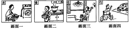 3、语言运用题 欣赏漫画《低碳生活》(“低碳生活”指低能耗、低污染、低排放的生活方式)。请仿照画面二、三的文字,补写其余两处。要求:①紧扣画面内容;②写两个5字句;③句末押韵。