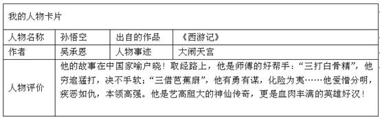同学们,相信你对我国古典四大名著之一的《西游记》并不陌生吧!请阅读下面的四则材料,从材料中选出一个你最喜欢的人物,制作人物卡片。(请将人物卡片补充完整。其中“人物事迹”一栏只需简要概括人物的一个故事名称即可;“人物评价”不少于50字。)(7分)