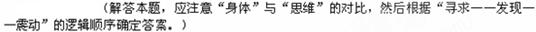 参考答案:B 本题解析:辨析病句首先应熟知病句的类型,最常用的判别方法是划分句子结构成分,先看主谓宾,再看定状补,判断句子是否存在成分残缺赘余、搭配不当、结构混乱、语序不当等问题。如果结构上没有问题,可从逻辑意义上分析,看是否有表意不明、句意关系不当等问题。还有一个简捷的方法便是借助标志法,比如,如果句中出现关联词,可从关联词的搭配、语序、逻辑等三个方面考虑;如果出现介词,可从主语残缺、中途易辙、主客颠倒等角度考虑。需要掌握的应试技巧有:语感审读法、筋脉梳理法、造句类比法、逻辑分析法和规律标志法等。此题中,A:构造与叙述不搭配,改为采取天马行空般的叙述和陌生化的处理。C:关键与是否两面对一面。D:如果与万一重复。 本题难度:一般 4、语言运用题 阅读下面有关“狼孩”的三则报道,推断语言学家得出的结论。(6分) 参考答案:人类学习语言最重要的时期是幼儿期(3分),如果这一时期没能学会语言,此后再学就很困难(3分) 本题解析:此题要求全面理解有关“狼孩”的三则报道,找出三则材料的共同点,推断结论—“人类学习语言最重要的时期是幼儿期”“ 如果这一时期没能学会语言,此后再学就很困难”。 本题难度:一般 5、单选题 3将下列语句依次填人文中的横线处,使上下文语意连贯。只填序号。(2分) 参考答案:C 本题解析: 本题难度:一般 |
