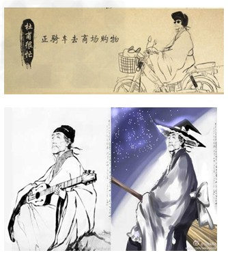 2012年3月,杜甫突然在网络爆红,关于他的涂鸦图片在微博上疯传。有人对语文课本中关于杜甫的图片进行了“再创作”,在这些“再创作”的图片里,杜甫时而手扛机枪,时而挥刀切瓜,时而身骑白马,时而脚踏摩托,时而变成哈利·波特骑着扫帚……被网友戏称为“杜甫很忙”。