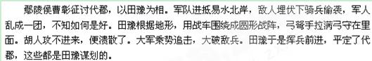 鄢陵侯彰征代郡,以豫为相。军次易北,虏伏骑击之,军人扰乱,莫知所为。豫因地形,回车结圜阵,弓弩持满于内。胡不能进,散去。追击,大破之,遂前平代,皆豫策也。