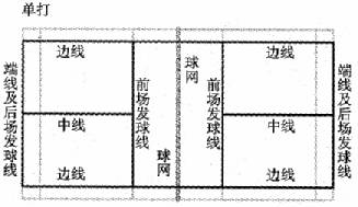 羽毛球单打场地示意图由球网分成两个场地,每个场地都有前场发球线、两条边线、一条中线和端线及后场发球线。