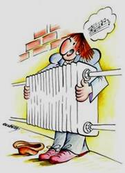 本题解析:图文转换是近几年考查频率较高的一种题型。解题时应先认真阅读图片及说明,对考题有一个整体的了解,把握一个大主题或方向。要通过整体阅读,搜索有效信息。再根据图片的相关信息,分析概括其内涵。本题是一个乞丐靠在墙上,抱着暖气片,边演奏手风琴的样子,边唱歌的内容,表现了他对音乐的热爱和乐观的生活态度。