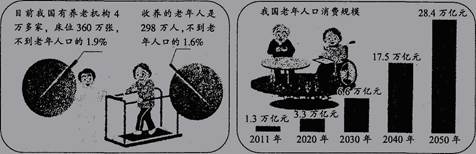 本题答案:(1)我国夕阳产业投入严重不足,不能满足老龄化社会的养老需求。(2分)(2)未来40年我国老年人口消费规模呈快速增长趋势。(1分)(3)①政府加大夕阳产业的投入,并鼓励社会力量投资;(2分)②采取多样化养老方式,减缓社会化养老的压力。(任何一点即可)