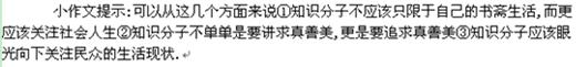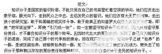 1、语言运用题 一九二零年四月二十八号,北京大学为筹备中国首个五一劳动节,李大钊、陈独秀等人在李大钊先生的家中商量游行等事宜,当 时李大钊先生的家中挂着这么一副对联:“出研究室入监狱,南方兼有北方强。” 并约定在《新青年》第7卷第6期出版“劳动节纪念号”。北京大学校长蔡元培先生为《新青年》题字:“劳工神圣。”就知识分子的责任来评价所给材料。
