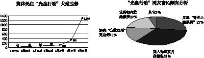 本题解析:试题分析:解题时,首先要注意图表标题,看清图表内容;明确图表所反映的信息。第一幅图是“媒体关注‘光盘行动’大致走势”,可以看到媒体的关注度在一周内急速上升;第二幅图是“‘光盘行动’网友言论倾向分析”,可以看出大多数网友是支持“光盘行动”的。将这些信息进行简单概括即可。