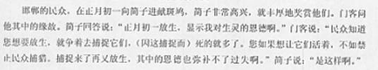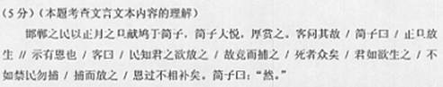 2、阅读题 用斜线(/)给下面短文画横线的部分断句。(5分) 邯郸之民以正月之旦献鸠于简子,简子大悦,厚赏之。客 问 其 故 筒 子 曰 正 旦 放生 示 有 恩 也 客 曰 民 知 君 之 欲 放 之 故 竟 而 捕 死 者 众 矣 君 如 欲生 之 不 如 禁 民 勿捕 捕 而 放 之 恩 过 不 相 补 矣。简子曰:“然。”(取材自《列子,说符》) 【注解】简子:即赵简子,当时晋国地位显赫的大臣。