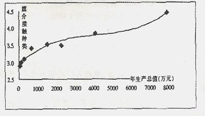 从整体来说,? A?,但这种增长并非是线性的。从年生产总值与媒介接触种类的变化关系看,在经济欠发达地区(年生产总值少于1000万元),国民媒介接触种类随经济水平的上升呈快速上升;? B?;在经济发达区域(年生产总值超过5000万元),随经济水平的上升又带来国民媒介接触种类的急剧上升。由此我们可以推测:在经济水平达到一定发达程度后,国民媒介接触种类会有一个爆发式增长。