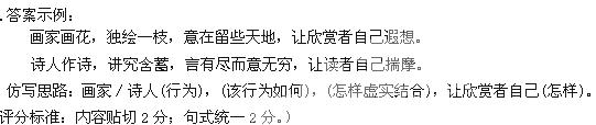 本题解析:仿写先看清事例是一个什么样的句子,各个成分之间有什么样的关系,然后比着葫芦画瓢。一定要注意句式要相同或相似,然后看清楚有没有修辞手法。 考点:本题考查学生“仿用句式”的能力,能力层级为E级。 点评:做仿写题,首先,看题目,明确显性要求。有的题目对句式、修辞格、仿句内容等有明确限定,只有将题中的这些要求吃透,才能写出符合要求的规范句子。其次,审例句,明确隐性要求。有的题目没有明确告知仿写要求,这就要我们仔细分析,这一步是答题的关键。不同的例句隐性要求不同,我们一般可从“形神”两方面去考虑。