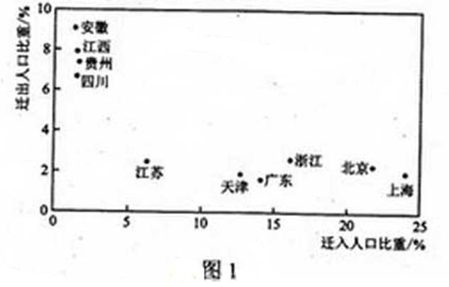 图1表示我国部分省级行政区城2005-2010年间迁移人口比重。迁移人口以青壮年为主.读图1并结合相关知识,完成1-2题.