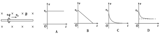 1、选择题 如图为一个质量为m、电荷量为+q的圆环,可在水平放置的足够长的粗糙细杆上滑动,细杆处于磁感应强度为B的匀强磁场中,现给圆环向右的初速度v0,在以后的运动过程中,圆环运动的速度图象可能是下图中的(?)