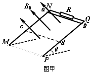 3、计算题  如图甲所示,MN、PQ为间距L=0.5m足够长的平行导轨,NQ⊥MN,导轨的电阻均不计。导轨平面与水平面间的夹角θ=37°,NQ间连接有一个R=4Ω的电阻。有一匀强磁场垂直于导轨平面且方向向上,磁感应强度为B0=1T。将一根质量为m=0.05kg的金属棒ab紧靠NQ放置在导轨上,且与导轨接触良好。现由静止释放金属棒,当金属棒滑行至cd处时达到稳定速度,已知在此过程中通过金属棒截面的电量q=0.2C,且金属棒的加速度a与速度v的关系如图乙所示,设金属棒沿导轨向下运动过程中始终与NQ平行。(取g=10m/s2,sin37°=0.6,cos37°=0.8)求: