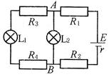 参考答案:L4突然熄灭后,外电路总电阻增大,根据闭合电路欧姆定律得知:电路中总电流I减小,L1两端电压U1=E-I(R+r),I减小,其他量不变,则U1增大,L1更亮.L2中电流I2=I-I1,I减小,I1增大,则I2减小,L2变暗.L3电压U3=U1-U2,U1增大,U2减小,则U3增大,L3更亮.所以L1、L3更亮,L2变暗. 本题解析: 本题难度:简单 4、选择题  如图所示电路中,两灯均不亮,已知电路中只有一处故障,且除两个灯泡外其余部分均完好,在不拆开电路的情况下,某同学用一根导线去查找电路的故障,他将导线先并接在灯L1两端,发现L2亮,L1不亮,然后将导线并接在灯L2两端,发现两灯均不亮,由此可判断(  ) |