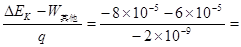 4、选择题  一个电量为q= —2×10-9c的质点,在静电场中由a点移到b点。此过程中,除电场力外,其他力做功6×10-5J,质点动能减少8×10-5J。则ab两点的电势差Uab为: