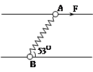 1、计算题 (11分)如图所示,A、B两滑环分别套在间距为1m的光滑细杆上,A和B的质量分别为1kg、3kg,用一自然长度为1m的轻弹簧将两环相连,在A环上作用一沿杆方向的、大小为20N的拉力F,当两环都沿杆以相同的加速度运动时,弹簧与杆夹角为53O(cos530=0.6)。求: