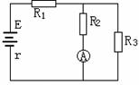 5、计算题 如图所示电路中,电源电动势E=" 12V" ,内电阻r =" 1.0Ω" ,电阻R1=9.0Ω,R2= 15Ω,电流表A示数为0.40A ,求电阻R3的阻值和它消耗的电功率。