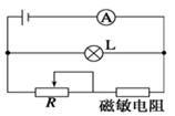 1、选择题 已知磁敏电阻在没有磁场时电阻很小,有磁场时电阻变大,并且磁场越强阻值越大.为探测磁场的有无,利用磁敏电阻作为传感器设计了如图所示电路,电源的电动势E和内阻r不变,在没有磁场时调节变阻器R使灯泡L正常发光.若探测装置从无磁场区进入强磁场区(灯泡不会烧坏),则? ( ? )
