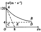 3、计算题 “神舟七号”飞船返回舱返回时,开始阶段通过自身制动发动机使飞船进行竖直减速下降,这一过程若返回舱所受空气阻力与速度的平方成正比,比例系数为k。从某时刻起开始计时,返回舱的v-t图象如图所示,图中AE是曲线在A点的切线,切线交横轴于一点E,其坐标为(8,0),CD是AB的渐近线,返回舱质量m=400 kg,g取10 m/s2,试问: