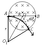 设有界圆磁场的半径为R,带电粒子的做匀速圆周运动的半径为r,OC与OB成600角,所以∠AO1C=60°,带电粒子做匀速圆周运动,从C点穿出,画出轨迹,找到圆心O1,中