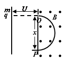 1、选择题 如图所示,一个静止的质量为m,带电量为+q的带电粒子(不计重力),经电压U加速后垂直进入磁感应强度为B的匀强磁场中,粒子打至P点,设OP=x,能正确反映x与U之间函数关系的x—U图如图中的( )