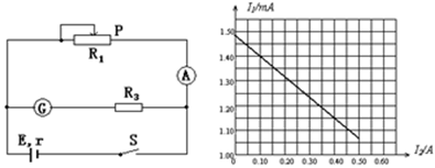 本题解析: 试题分析:(1)为方便实验操作,滑动变阻器的阻值不能太大,选择D比较合适。 (2)由于没有电压表,给定的电流表G可与定值电阻R3串联作电压表使用,实验电路如上左图所示。 (3)根据表中实验数据在坐标系内描出对应点,然后作出I1-I2图象如上右图所示。 (4)则由闭合电路欧姆定律可知:I1(R3+RA)=E-I2r,变形 ,由图可知,图象与纵坐标的交点为1.48mA,解得E=1.48V;由图象可知,r=0.82Ω